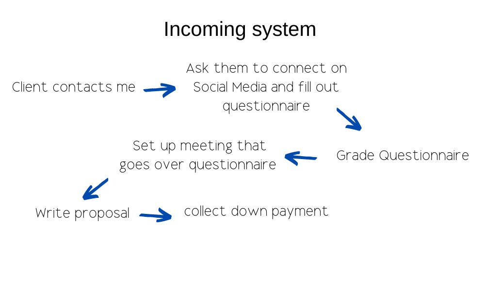 It’s a filter to make sure that it’s people who actually want to embark on the project, and it’s to ward off people who are just kind of scope creeping, and they just a general answer of how much something is going to be because nothing is ever clear cut on– Just because you need this, I don’t exactly know the entire– what you didn’t tell me to do. I’ll connect with them on LinkedIn or Facebook, and I’ll send them a questionnaire. They fill out the questionnaire, I look it over for about three days just to get a good understanding of what their goals are, what their company’s about, who their audience is to make sure they know that they have an audience, then I’ll look it over.