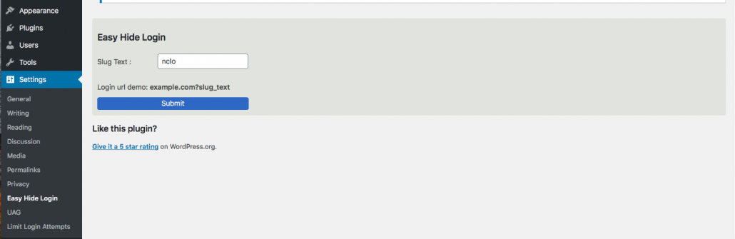 Installing this plugin is easy and straightforward to set up. Install the plugin and activate, then hover on the settings tab, and you will see Easy Hide Login. Click on the Easy Hide Login setting and change the name of the login URL.