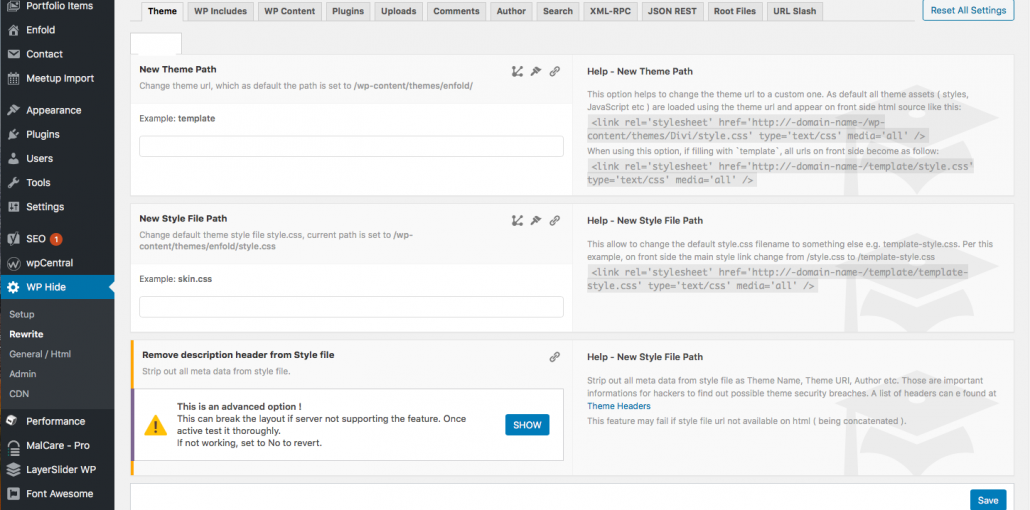 These three folders make up the WordPress framework, and every WordPress framework folder has these names as a default. You could change these file names through the backend, but you would need the experience to ensure that nothing in your WordPress website breaks after changing the names. Fortunately for you, there is this nifty plugin Wp Hide + Security Enhancer. This plugin allows you to change the folder, theme, and plugin file names by creating redirects in your .htaccess folder. By making the redirect links, the plugin overrides the default names with the new names. So instead of www.example.com/wp-content/themes, it changes it to www.example.com/my_assets/95jhojn6. The file name change will create an extra security level that will repel script attacks that try to gain access into these important folders to plant backdoors. You do have to be careful with this plugin because it might, and I mean on a rare occasion, will break your site, but this plugin will give you a recovery link.
